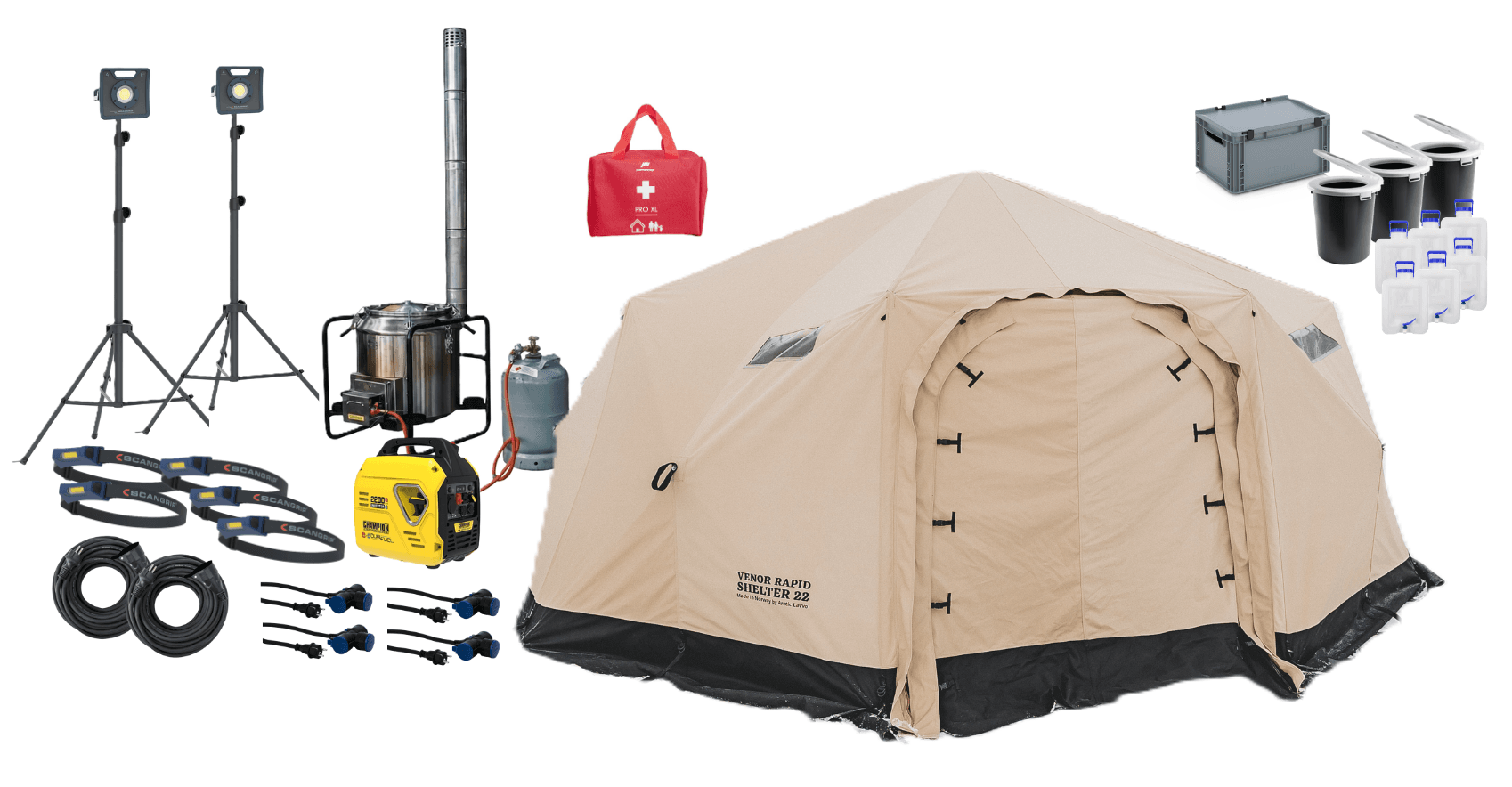 Komplett paketlösning för att snabbt upprätta en trygghetspunkt vid samhällsstörningar. Bygger på Venor Rapid Shelter-tält och innehåller vattenvärmare, belysning, elverk och sanitetslösning – utformat enligt Myndigheten för civilt försvars riktlinjer. Finns i fyra storlekar med uppsättningstid som räknas i minuter.